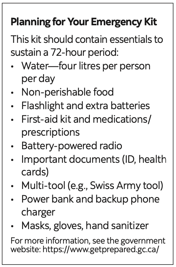 - Keep water, food and batteries stocked (see inset: “Planning for Your Emergency Kit”).
