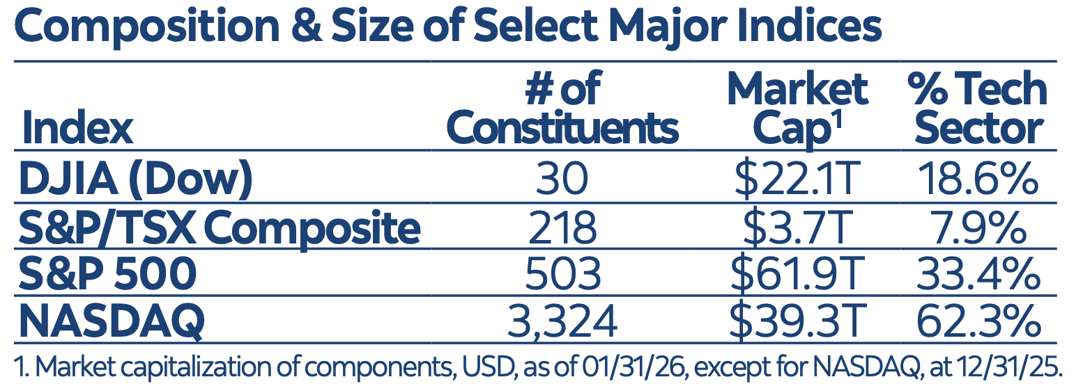 What distinguishes the Dow is its “price-weighted” methodology. The index is calculated by adding component share prices and dividing them by a divisor that accounts for stock splits or other structural changes. By contrast, indices such as the S&P/ TSX Composite, S&P 500 and NASDAQ are weighted based on share of total market capitalization (share price multiplied by outstanding shares).