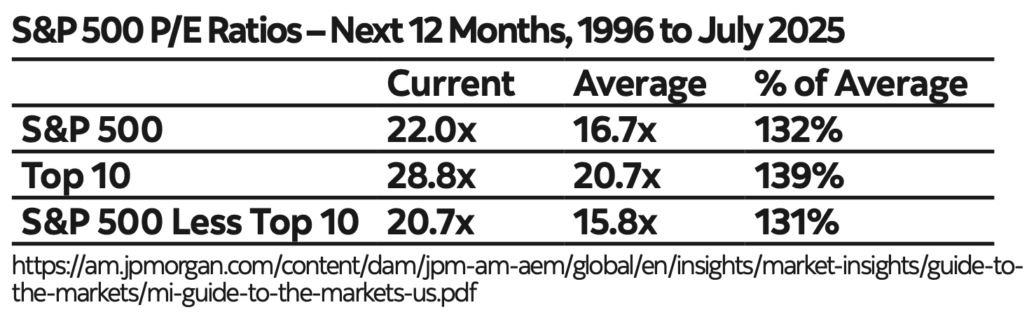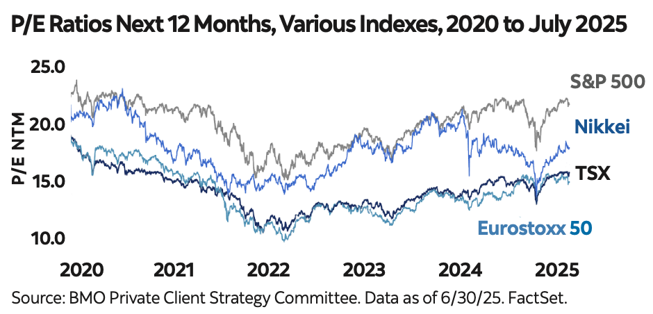 Where do markets stand today? At the end of June, the forward- looking P/E ratio for the S&P/TSX Index was 17.0x.1 For the S&P 500, it was around 22.0x, with the top 10 stocks in the index at 28.8x—both significantly above long-term averages: